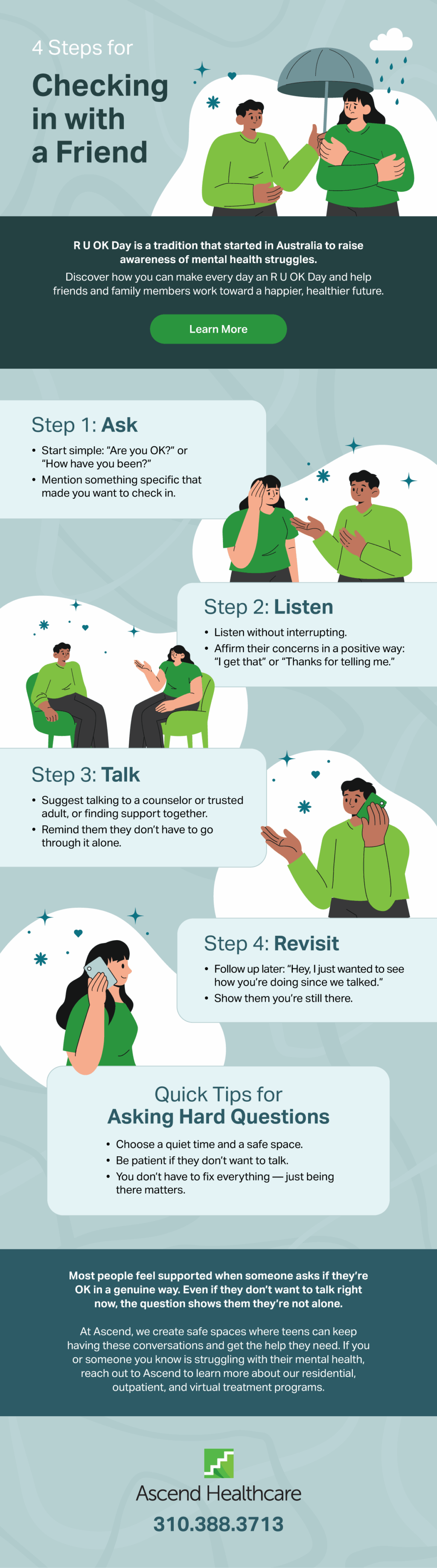 R U OK Day is a national day of action that started in Australia. It’s such a powerful movement that the team at Ascend wants to implement it for US teens as well! This day is meant to remind us to start talking about mental health, destigmatize asking for help, and learn how to ask hard mental health questions.